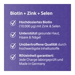 Auf die Einnahme weiterer zinkhaltiger Nahrungsergänzungsmittel sowie den Verzehr weiterer Nahrungsergänzungsmittel mit Selen ist zu verzichten. Haut, Haare und Nägel benötigen Zeit, um durch die Ernährung positiv beeinflusst zu werden. Deshalb ist eine Einnahme von "Biotin + Zink + Selen für Haut, Haare und Nägel" von R(h)ein Nutrition über mehrere Monate zu empfehlen. In einigen Fällen kann ggf. auch eine dauerhafte Einnahme sinnvoll sein.