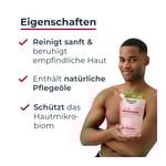Durch Anwendung der mikroplastikfreien* Körper- und Gesichtspflege wird die Haut beruhigt, langanhaltend mit Feuchtigkeit versorgt und fühlt sich geschmeidiger an. Sie hilft, die Hautbarriere zu stärken. Das Duschgel für sensible Haut stellt den hautphysiologischem pH-Wert wieder her und verringert Hautirriationen. 92% der Teilnehmenden einer Anwendungsstudie bestätigten, dass das Produkt empfindliche Haut beruhigt.**