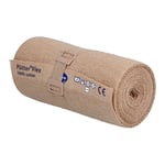 Besonders dünne, bi-elastische Kurzzugbinden, Längsdehnbarkeit ca. 90% mit zusätzlicher Querelastizität, hoher Arbeitsdruck mit niedrigem Ruhedruck, auch bei Dauerverbänden anhaltende Kompressionswirkung, atmungsaktiv und gut hautverträglich, durch die Querelastizität besonders einfach anzulegen und bequem zu tragen, kochfest und sterilisierbar (Dampf A 134°C), mit dauerhaft aufgedruckter Waschanleitung am Bindenende, hautfarben. 100% Baumwolle.