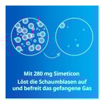 Simeticon wirkt, indem es die Oberflächenspannung der im Magen-Darm-Trakt vorhandenen Luftblasen verringert und deren Zusammenlagerung bewirkt, was dazu beiträgt, dass das Gas verteilt wird und die Gasspannung verringert wird. Simeticon wird vom Organismus weder aufgenommen noch verstoffwechselt, sondern wird ohne Veränderung mit dem Stuhl ausgeschieden. Die Weichkapsel löst sich schnell auf und wird danach vom Körper ausgeschieden. Sie fungiert nur als Trägerstoff für die Abgabe von Simeticon.